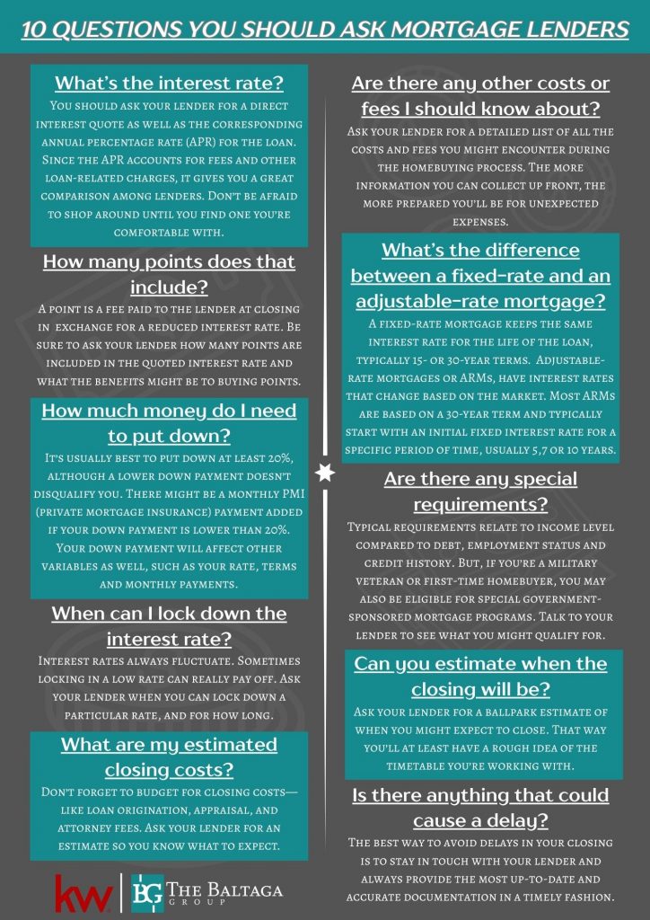 What are the best questions to ask a mortgage lender before you lock in a home loan? If you want to find the very best mortgage for your needs, it pays to not automatically go with the very first lender you see. It’s good practice to shop around to make sure you’re getting the best interest rate and loan terms. It’s a good idea to shop for a loan in a short time frame (less than 5-days), it’s lower impact on your credit score. Here’s a list of 10 questions to ask a lender.