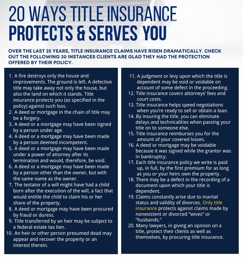 Title insurance is a type of insurance that protects homeowners (and lenders) against legal ownership claims of a home. If disputes over title ownership arise after the purchase, the insurance policy pays for any legal fees to resolve them. Unlike other types of insurance that help cover future mishaps, title insurance is designed to protect the policyholder from any past title discrepancies from the seller or previous owner that might be uncovered during or after the purchasing process.
